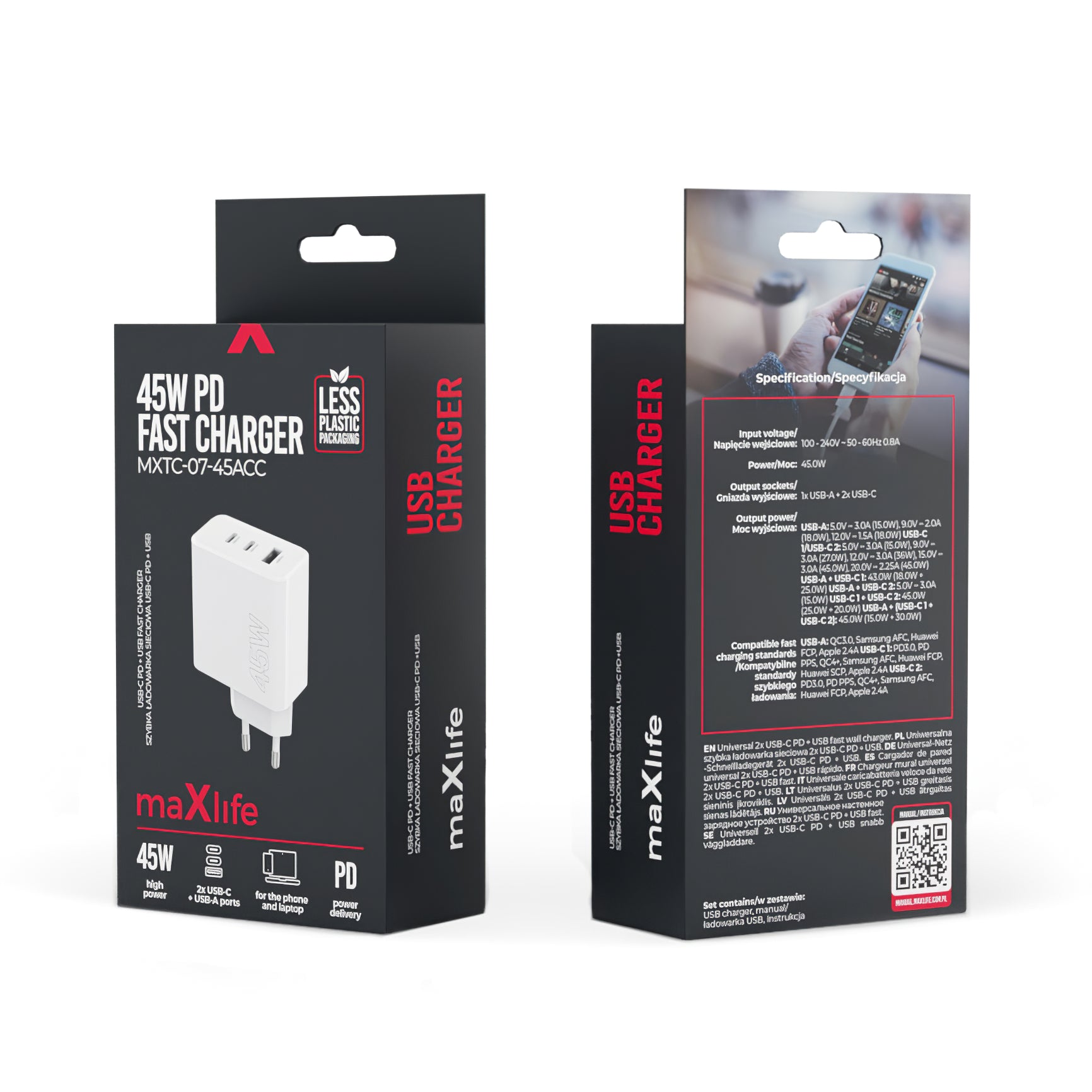 | Lähtö | USB-C (5V / 3A / 9V / 3A / 12V / 3A / 15V / 3A / 20V / 2.25A) / USB-A (5V / 3A / 9V / 2A / 12V / 1.5A) |