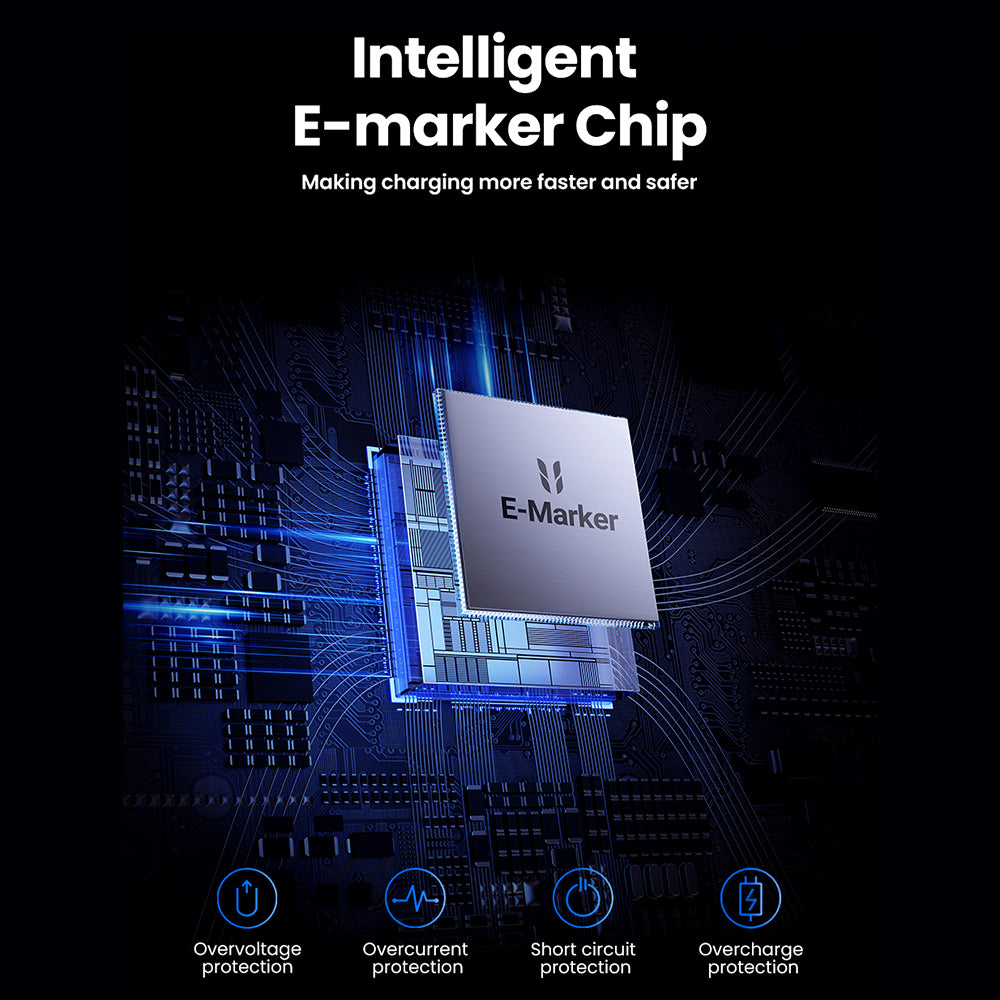 60 minuutissa - 2.5 kertaa nopeammin kuin tavallisilla kaapeleilla. Älykäs E-marker-siru säätää automaattisesti jännitettä ja virtaa laitteiden turvallisuuden varmistamiseksi, estäen